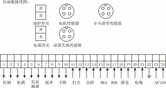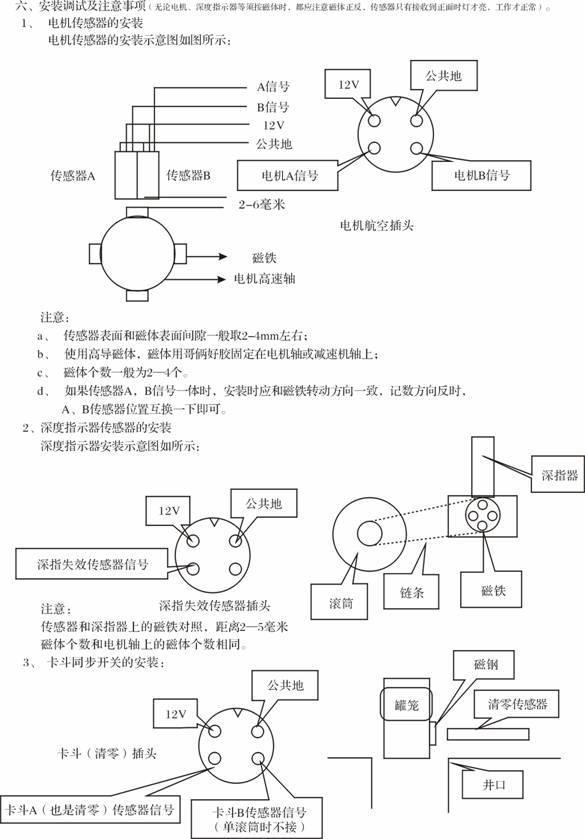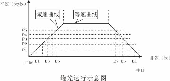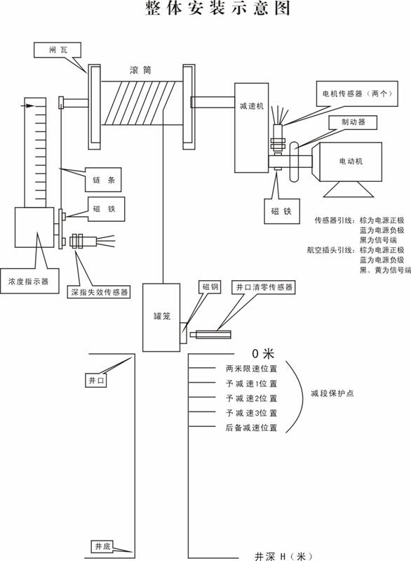 在井架上安装卡斗同步传感器,在机斗或罐笼上安装永久磁钢,开关与磁铁对应间隙40— 70mm。 注意: a、开关与磁钢对应处距停车位置应在零位 b、两套开关对应的高度应一致 4、参数设置 按SET键进入参数设置状态,再按SET键可选择需要更改的参数项,按上下键可以更改原参数(持续按上下键时参数值变化会越来越快),如果不知道后备减速、减速1、减速2、减速3、2米限速位置时,可以使容器位于井口开车,使容器向下运行,当运行到减速1,减速为4米/秒的位置为减速2,速度为3米/秒的位置为减速3,速度为2/秒米的位置为2米限速。小绞车有时不需要减速段保护,只要将保护值设大点即可,也可根据实际情况设定位置和速度保护值。 5、井口清零: 当参数设置完毕时要进行井口清零,容器在井口时同时按住CLR键和上下键3秒以上,深度指示窗口即清零。这种功能还用于如下情况: A:山于某些未知的原因引起零为错误时; B:参数表及含义由于深度变化或钢绳磨损,引起零位错误时; 6、 参 数 表